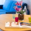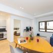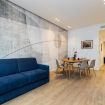 The spacious living area is designed for relaxation and entertainment, featuring a comfortable sofa bed, a flat-screen TV, and a stylish dining table for up to 6 people. The fully equipped open kitchen, fitted with premium appliances, offers a seamless cooking experience.