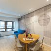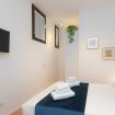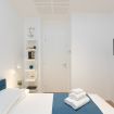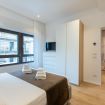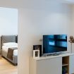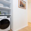Adding to the apartment’s convenience, a washer/dryer combo ensures comfort for longer stays, while well-organized storage solutions provide practicality without compromising style.