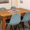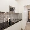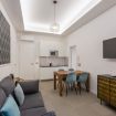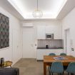 Soggiorno e angolo cottura: il comodo soggiorno accoglie gli ospiti con un arredamento semplice ma raffinato, in cui il bianco e il legno chiaro dominano gli spazi. Il salotto è dotato di un comodo divano e di un tavolo da pranzo per 4 persone, ideale per cene in compagnia. L'angolo cottura è attrezzato con microonde, macchina Nespresso e tutto l'occorrente per cucinare, perfetto per chi desidera preparare i propri pasti in totale autonomia.