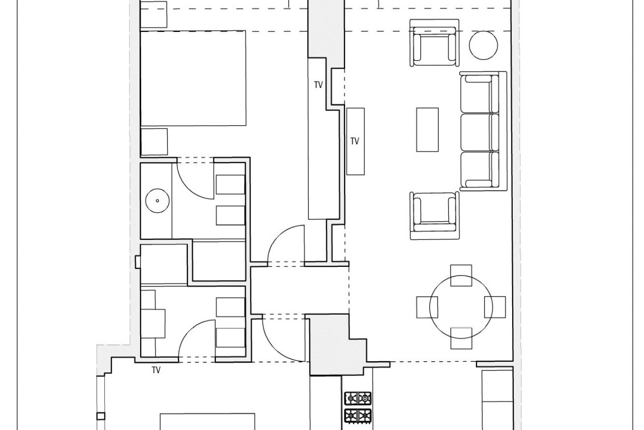 Gli spazi sono particolarmente ampi per 4 persone, entrambe le camere matrimoniali hanno un bagno en-suite, la cucina è attrezzata con tutti gli elettrodomestici, il soggiorno ha un divano, poltrone e un tavolo da pranzo.