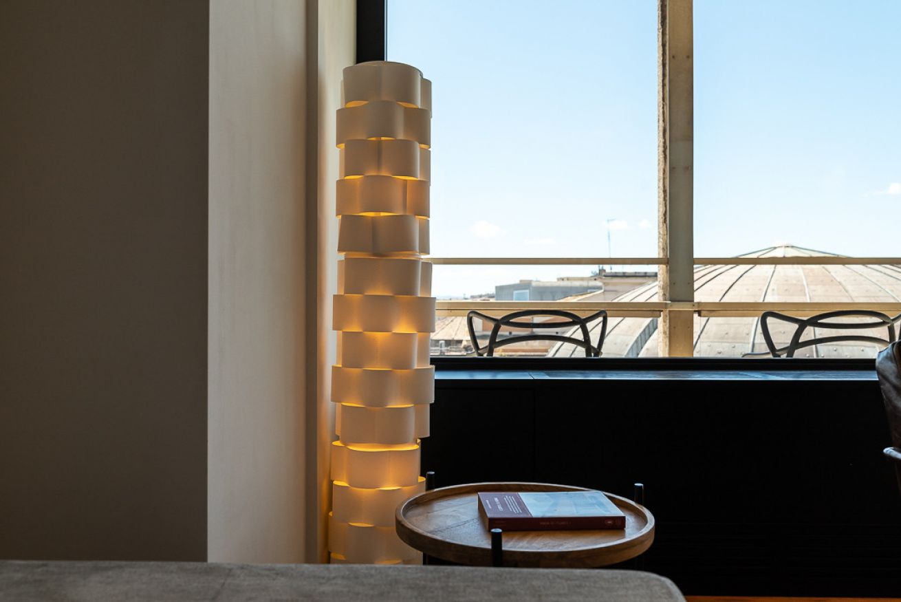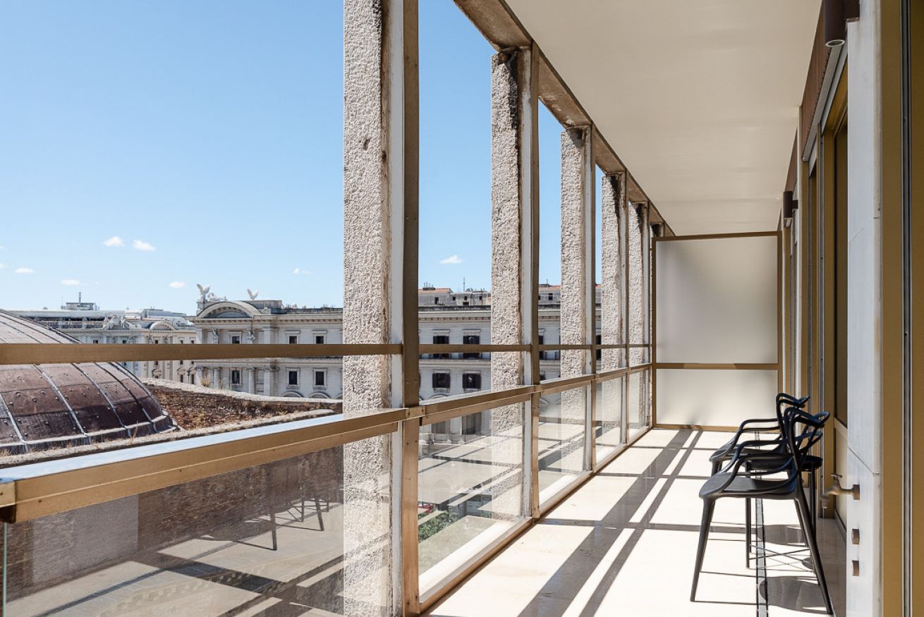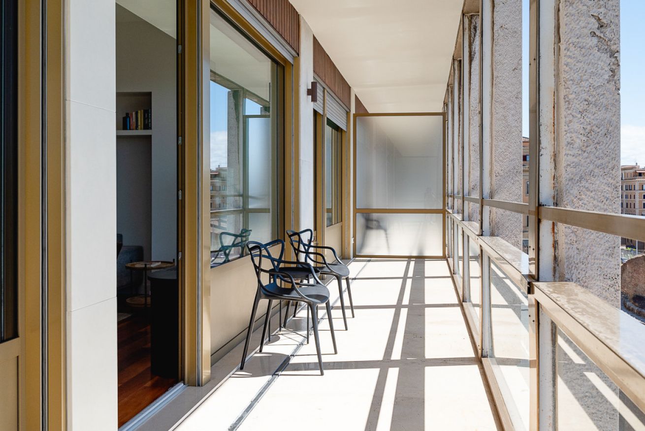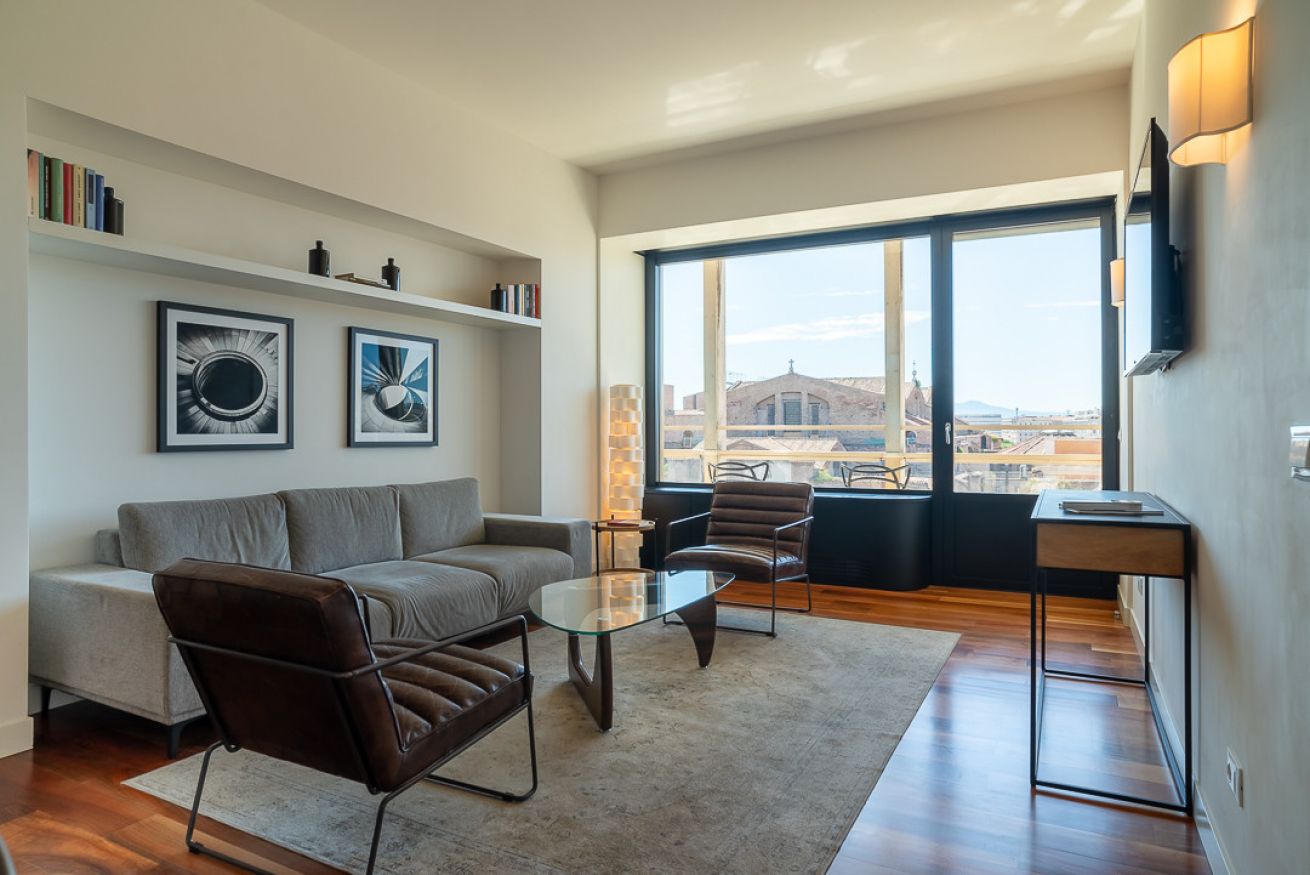 Uno degli spazi più suggestivi è senza dubbio la terrazza, alla quale si accede sia dal salotto che dalle due camere da letto, un angolo perfetto per leggere, fare colazione o ammirare la vista su uno dei siti archeologici più importanti di Roma, le terme di Diocleziano, il Chiostro di Michelangelo, la Basilica di Santa Maria degli Angeli, il Planetario, il Museo Archeologico di Palazzo Massimo e Piazza della Repubblica con la sua splendida fontana.