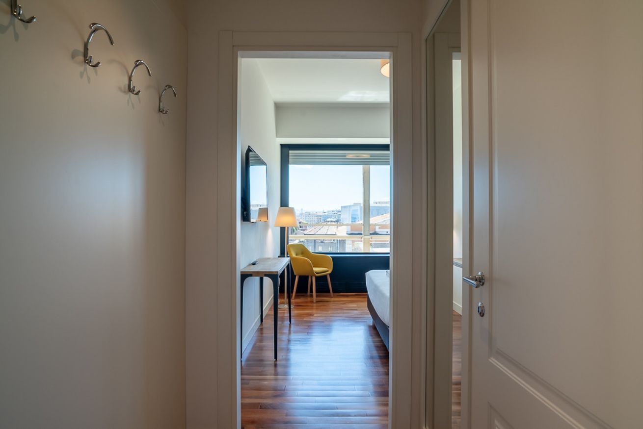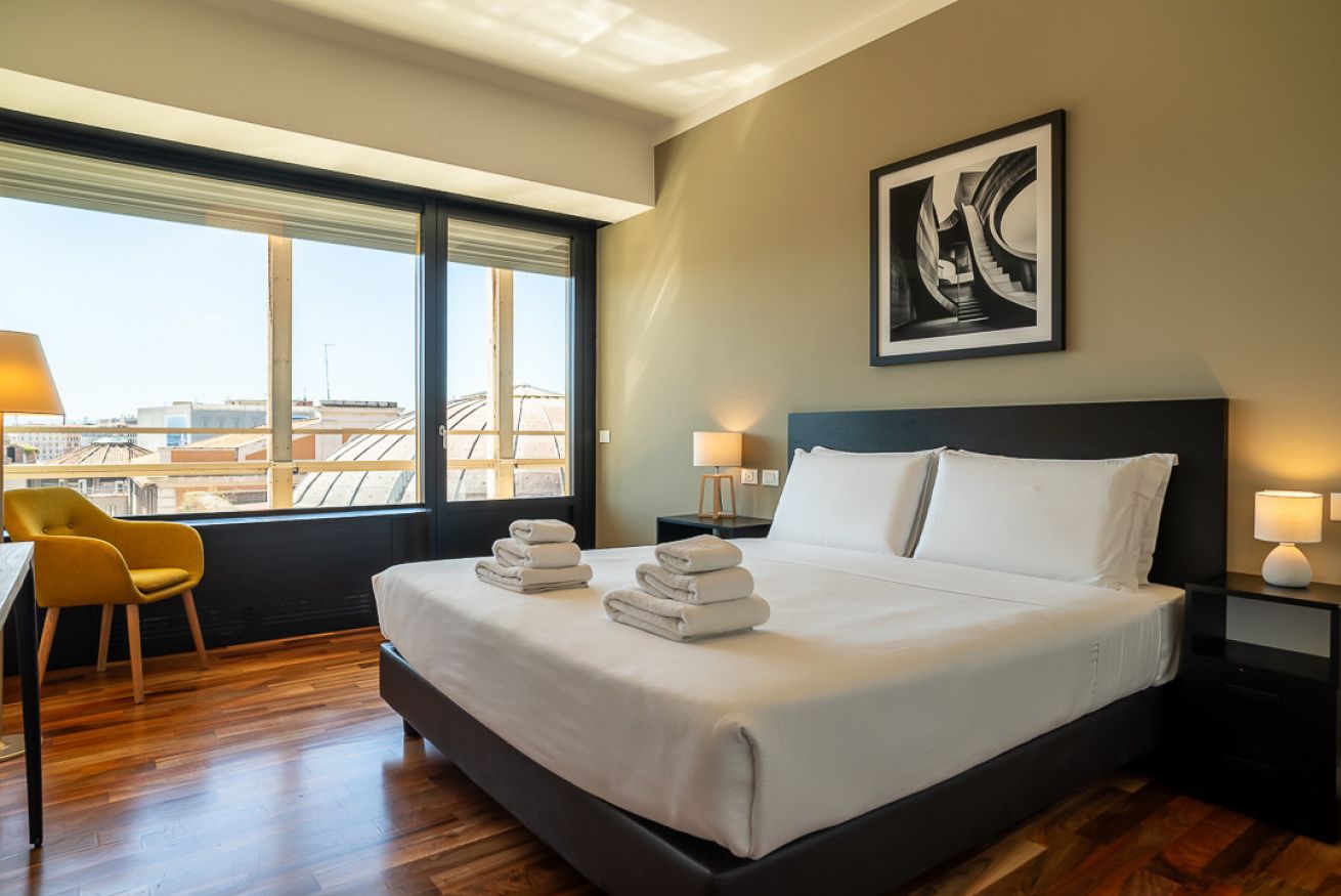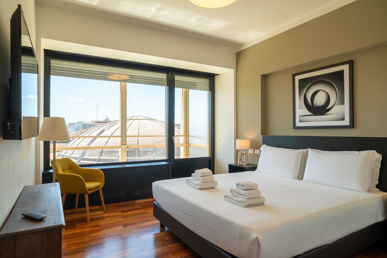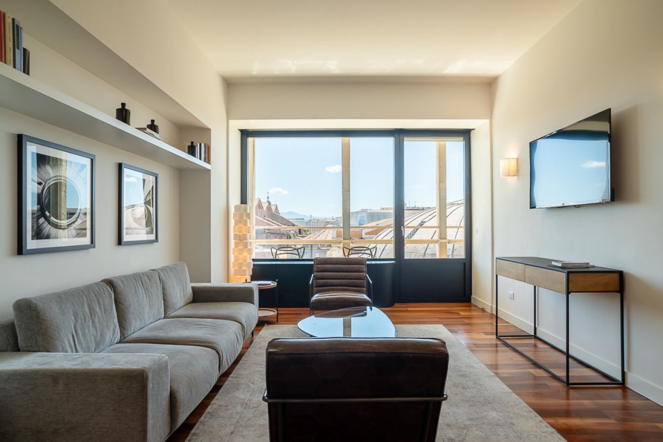 Uno degli spazi più suggestivi è senza dubbio la terrazza, alla quale si accede sia dal salotto che dalle due camere da letto, un angolo perfetto per leggere, fare colazione o ammirare la vista su uno dei siti archeologici più importanti di Roma, le terme di Diocleziano, il Chiostro di Michelangelo, la Basilica di Santa Maria degli Angeli, il Planetario, il Museo Archeologico di Palazzo Massimo e Piazza della Repubblica con la sua splendida fontana.