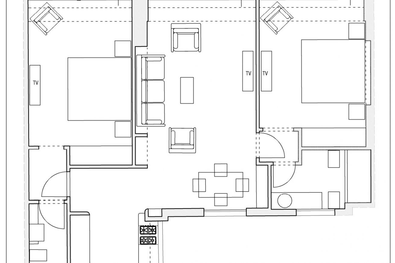 Gli spazi sono particolarmente ampi per 4 persone, entrambe le camere matrimoniali hanno un bagno en-suite, la cucina è attrezzata con tutti gli elettrodomestici, il soggiorno ha un divano, poltrone e un tavolo da pranzo.