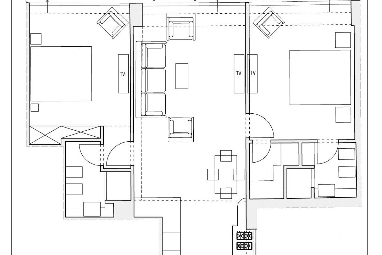Gli spazi sono particolarmente ampi per 4 persone, entrambe le camere matrimoniali hanno un bagno en-suite, la cucina è attrezzata con tutti gli elettrodomestici, il soggiorno ha un divano, poltrone e un tavolo da pranzo.